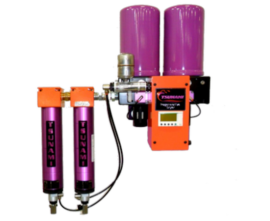 The 10Hp Tsunami Regenerative Drying System uses the latest technology to provide your application with the cleanest, driest compressed air available. Our systems are complete packages and include Tsunami water separators, oil coalescing filters and Moisture Minder® automatic drains to assure proper draining of water and oils.